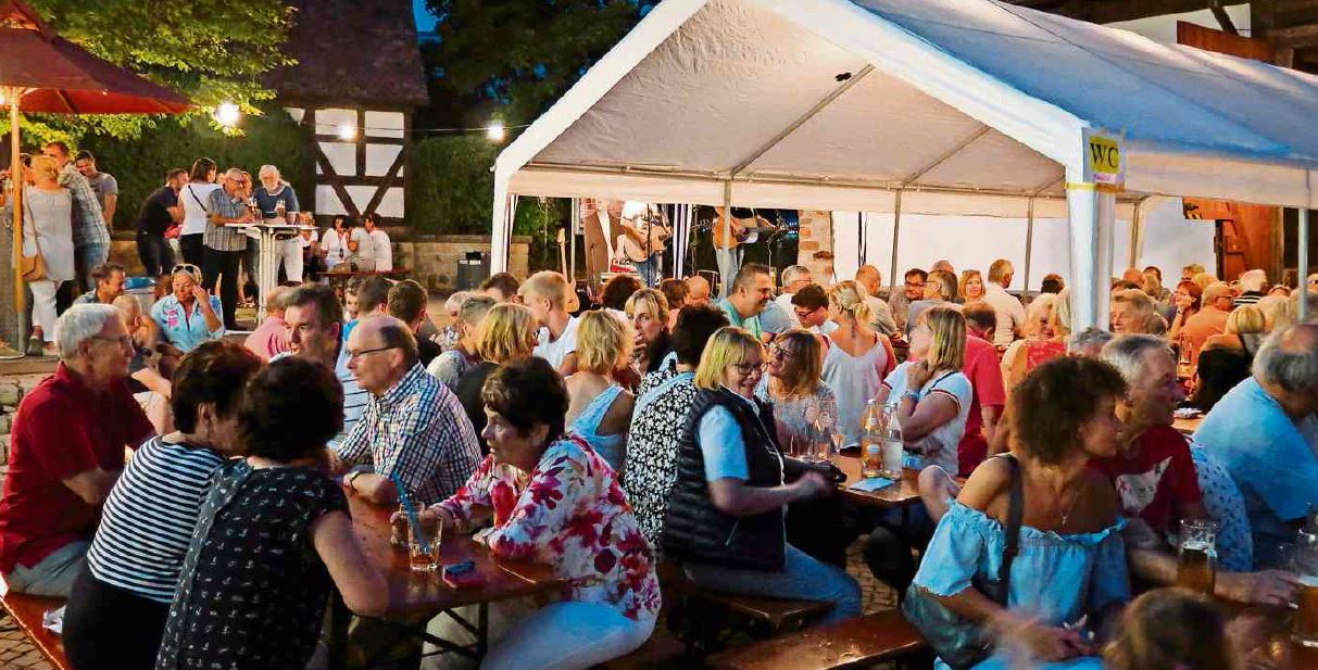 Vor dem dunkler werdenden Himmel zeichnen sich die Bäume hinter dem Großen Haus wie riesige Scherenschnitte ab. Auf der anderen Seite präsentiert sich der Mond genau im Halb. Die Nacht ist lau und die Stimmung bestens. Bei der Brunnenhocketse des Freundeskreises der Schmidener TSV-Handballer kennt jeder jeden. „Da sind die Schmidener unter sich, es ist wie eine riesige Nachbarschaftshocketse“, sagt Wolfgang Bürkle, Abteilungsleiter der Handballer im TSV. Vielleicht mal ein Oeffinger Fußballer verirre sich in den Nachbarflecken, sagt Bürkle und nickt den Herren freundlich zu.