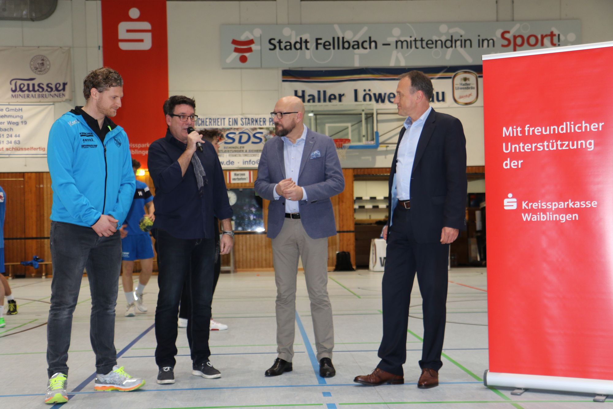 Kurz vor Spielbeginn führte Hallensprecher Uwe Scholz Interviews mit Karlheinz Weckerle (Filialdirektor Privatkunden Fellbach/Weinstadt), Rainer Lyhr (Leiter Produktmanagement/Marketing AOK) und Felix Lobedank (derzeit verletzter Spieler vom TVB), ehe wenig später unter dem ohrenbetäubenden Lärm der Fans auch die Einlaufkinder der weiblichen und männlichen E-Jugend des HSC Schmiden/Oeffingen ihren großen Auftritt hatten. Mit AOK-Shirts ausgestattet durften sie mit den Profis einlaufen und hatten sichtlich ihren Spaß dabei.