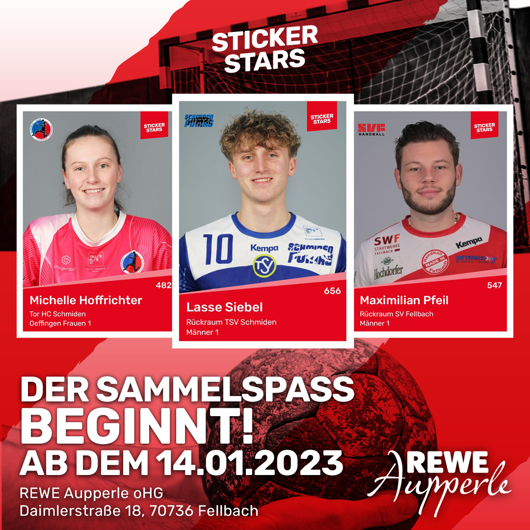 Hiermit laden wir euch zum Kick-Off der Stickerstar-Aktion am Samstag 14.01.2023 bei REWE Aupperle in Oeffingen ein. Der Sammelspaß mit den drei Fellbacher Handballvereinen TSV Schmiden, TV Oeffingen und dem SV Fellbach beginnt um 11.00 Uhr bei REWE Aupperle in der Daimlerstraße 18 in Oeffingen. Bis 14.00 Uhr gibt es zusätzlich Fleischkäsbrötchen, Getränke und leckere Waffeln.